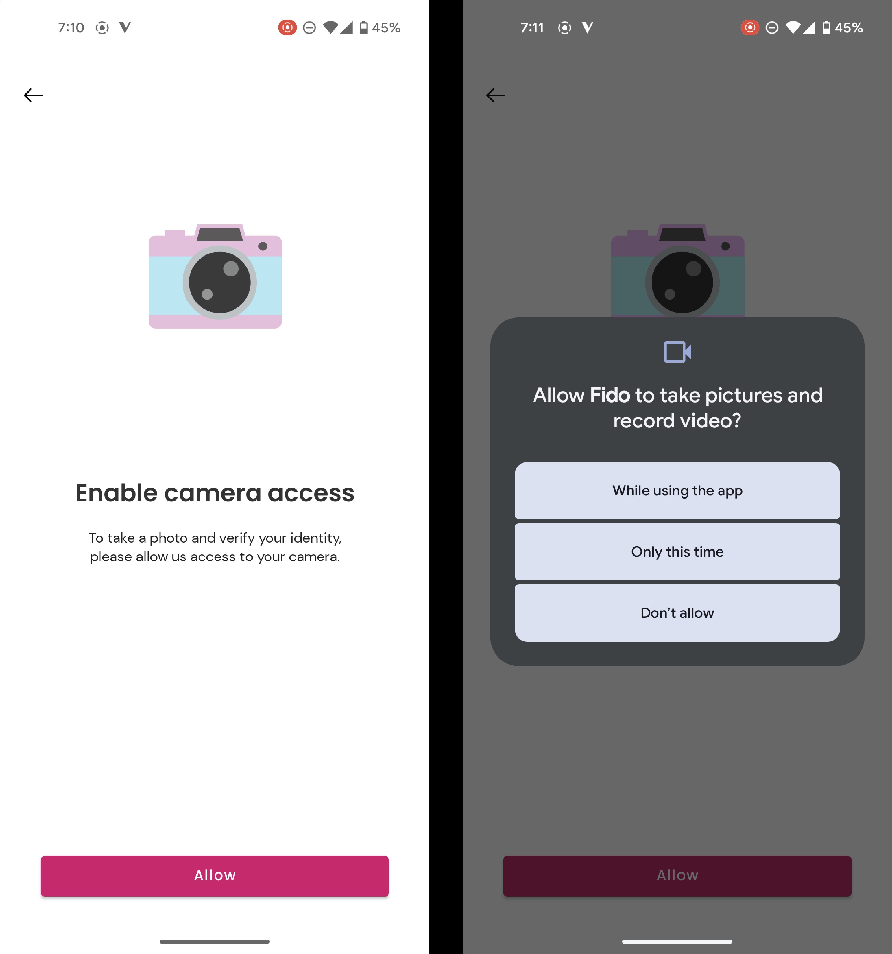 • Selecting the ‘Allow’ button to give access to the Fido App to use your camera.  Allow Fido to personalize your credit request. Your data will not be shared with anyone.